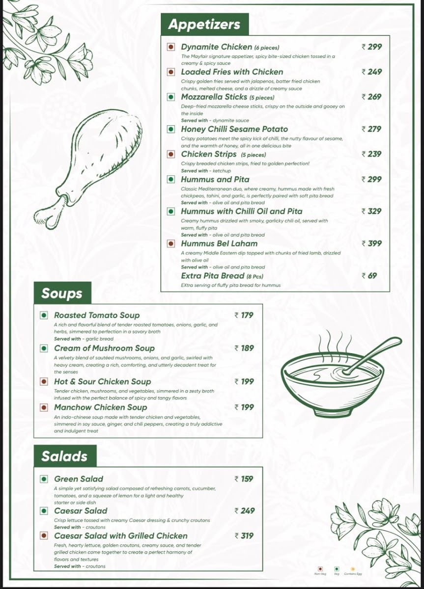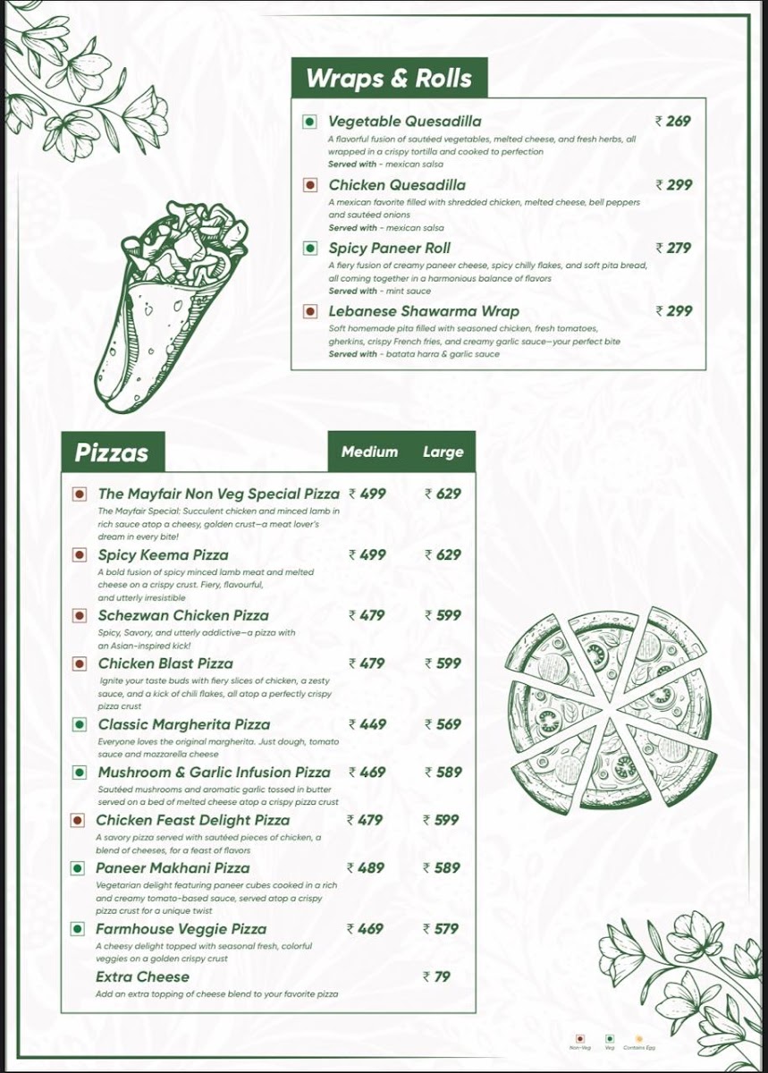 The Mayfair Cafe takes pride in its diverse menu, featuring everything from comforting soups to delectable main courses and tempting wraps. Begin your culinary journey with their Roasted Tomato Soup (₹169) — a rich and velvety delight that dances on the palate, or warm up with the Hot & Sour Chicken Soup (₹189), bursting with flavors that promise to awaken your senses. For something heartier, the Fish N Chips (₹389) is a must-try, expertly battered and served golden brown with a side of crispy fries. If you prefer a taste of the local cuisine, indulge in their Chilly Chicken or Chicken Kanti (both ₹469) — each dish showcasing the authentic spices and flavors of Kashmir.